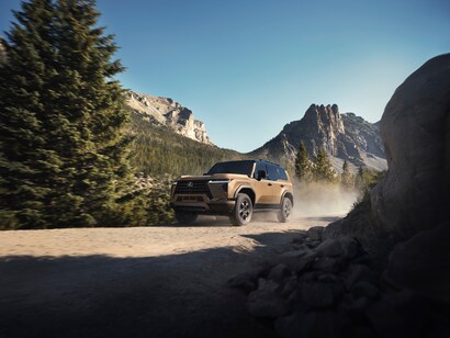 The 2024 Lexus GX 550 boasts a bold and sophisticated exterior design that commands attention on the road. With its distinctive spindle grille, sleek LED headlights, and muscular body lines, the GX 550 exudes confidence and refinement. Available 22-inch alloy wheels and a power moonroof add to the SUV's premium appearance. At the same time, the Overtrail trims feature rugged styling elements like black fender flares and a unique front bumper design.